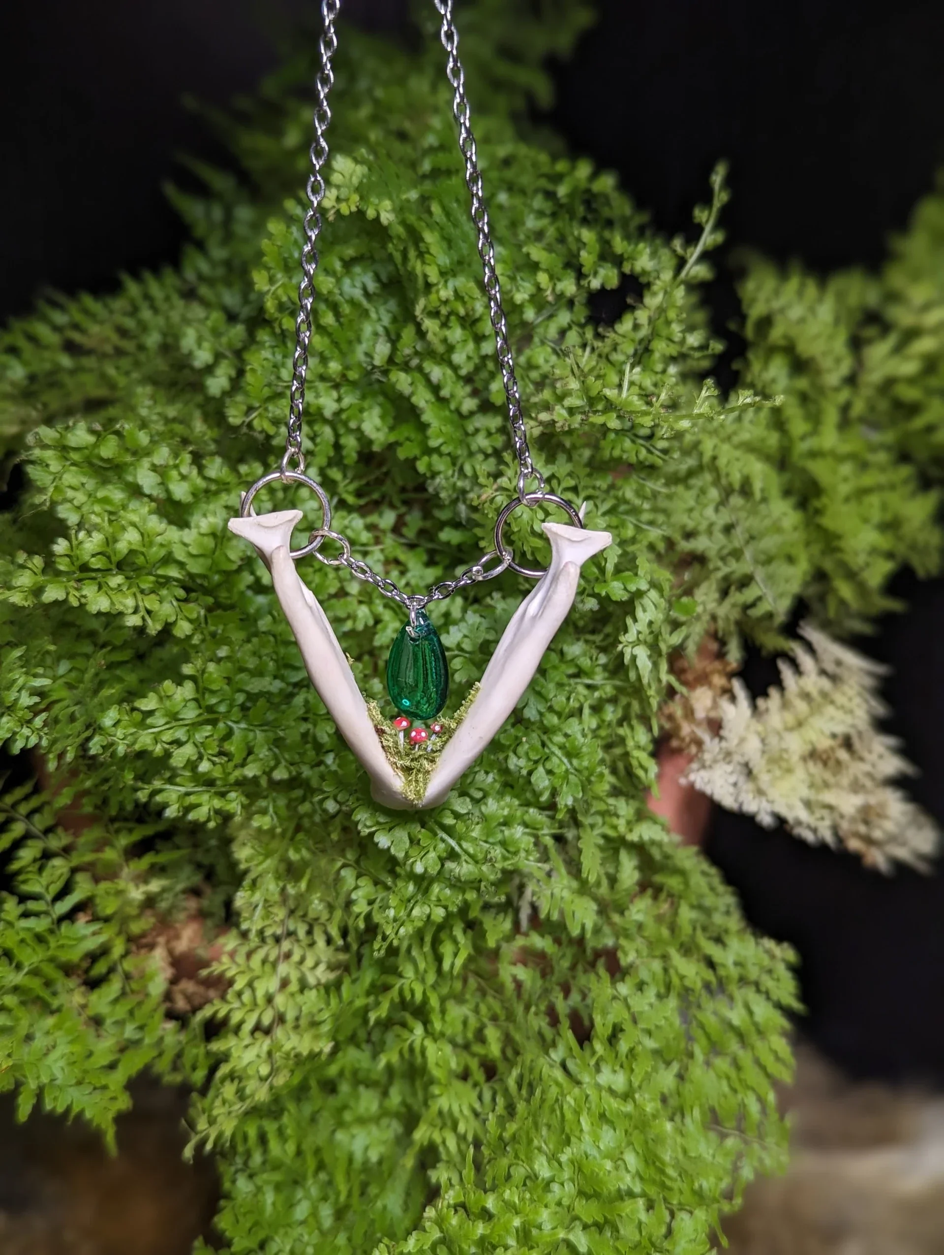 Cat jaw necklace with single silver chain, moss, mushrooms and teardrop emerald green gem - length from clasp to bottom of the jaw is 22.5cm