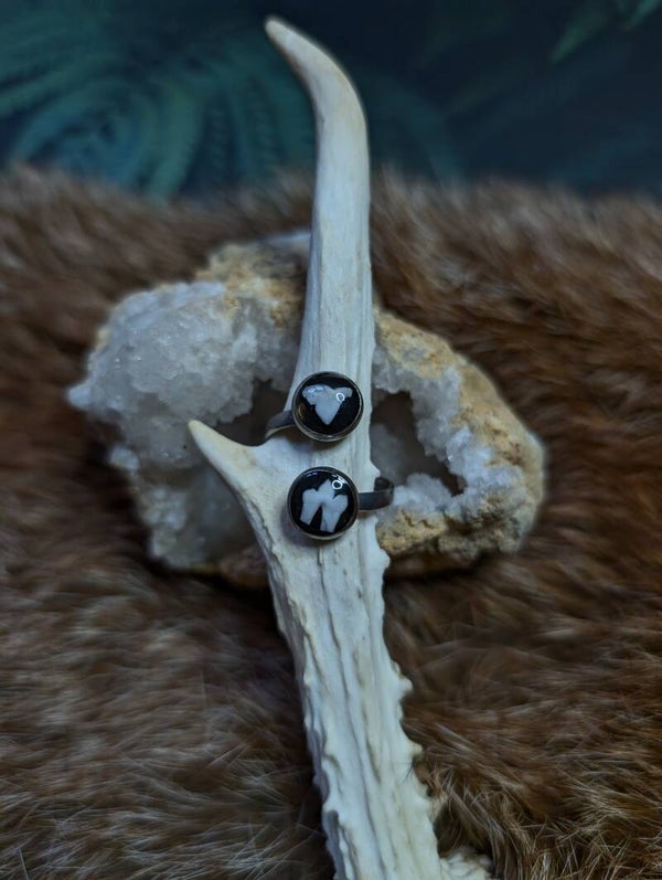 This ring has encased cat teeth from ferel farm cats that have passed natural on farms that then get donated to me. All handled with love and care.