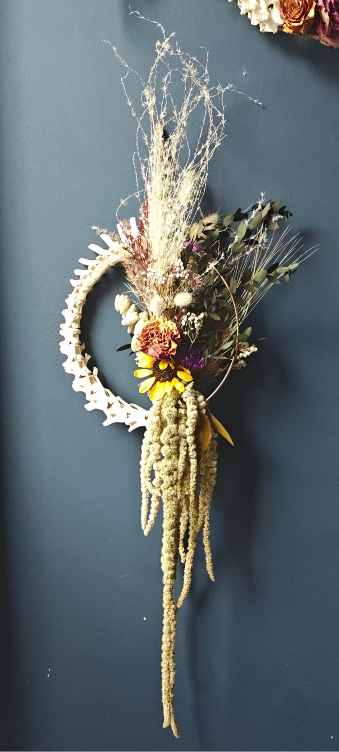 Double sided Fox spine on 7.5inch gold ring, with locally sourced hand picked and dried flowers and grasses. Long Cascades