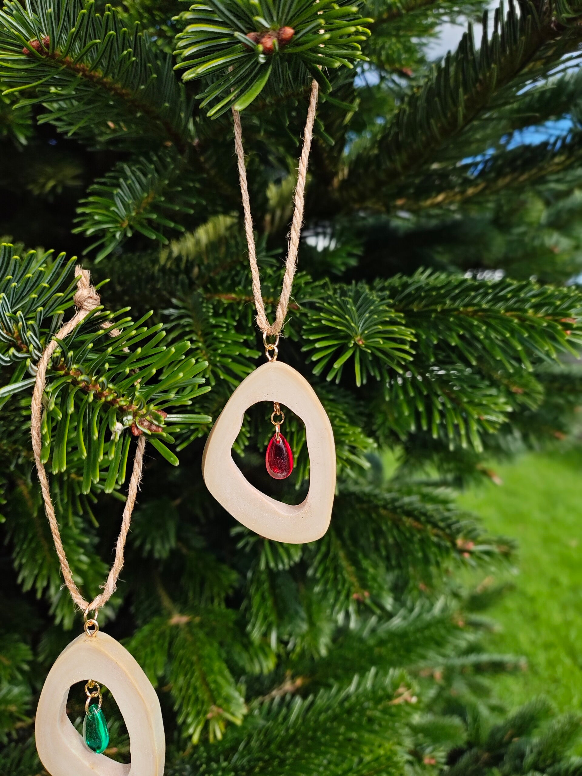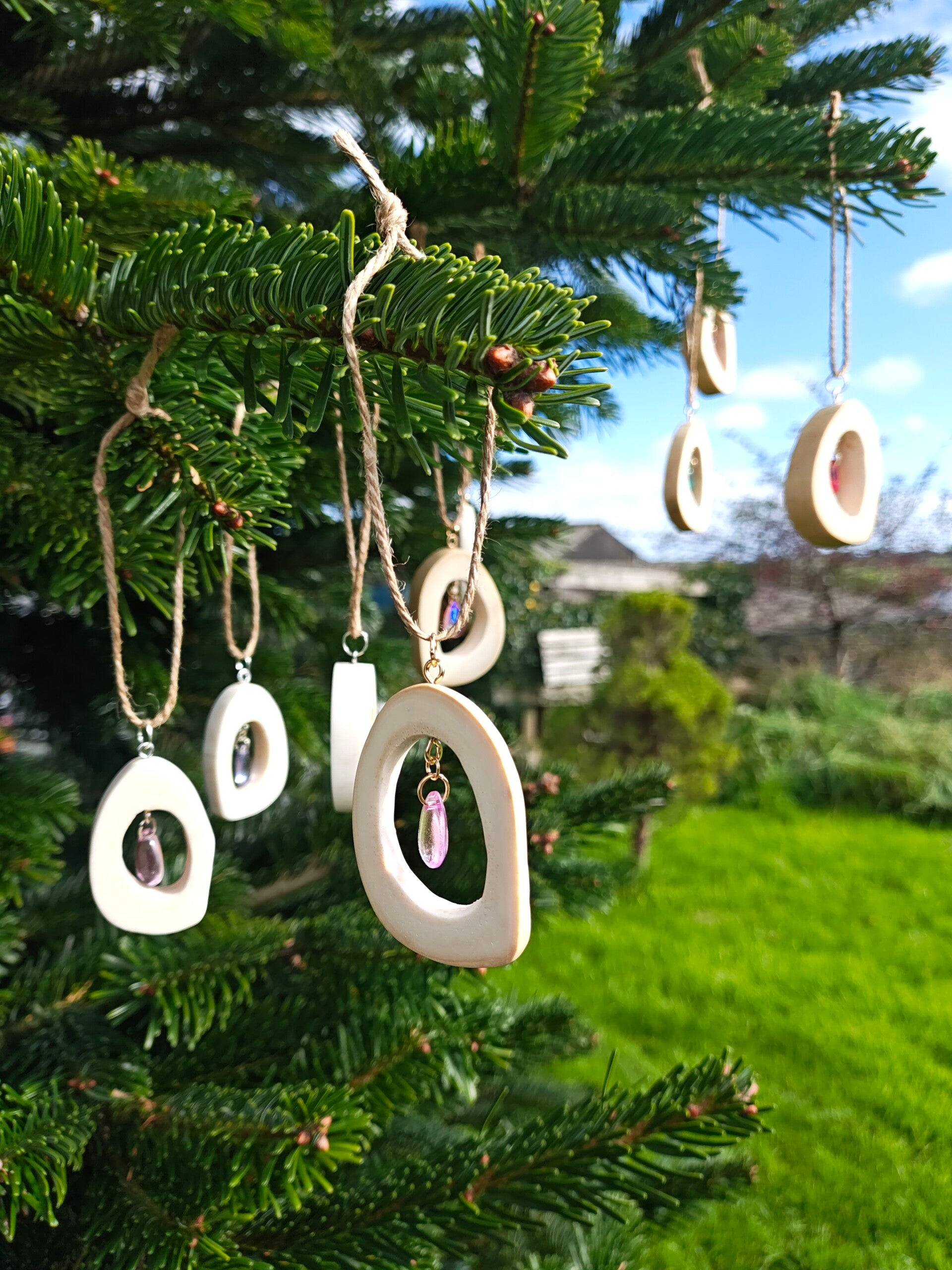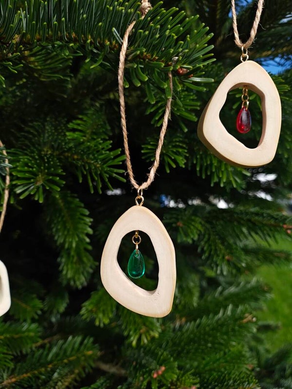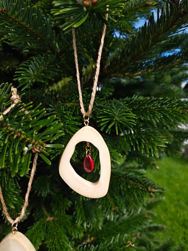 Baubles made from cow femur bone slices, hand polished to make smooth, adorned with a teardrop charm in the center. Comes with silver or gold hardware and Hessian cord hanger.